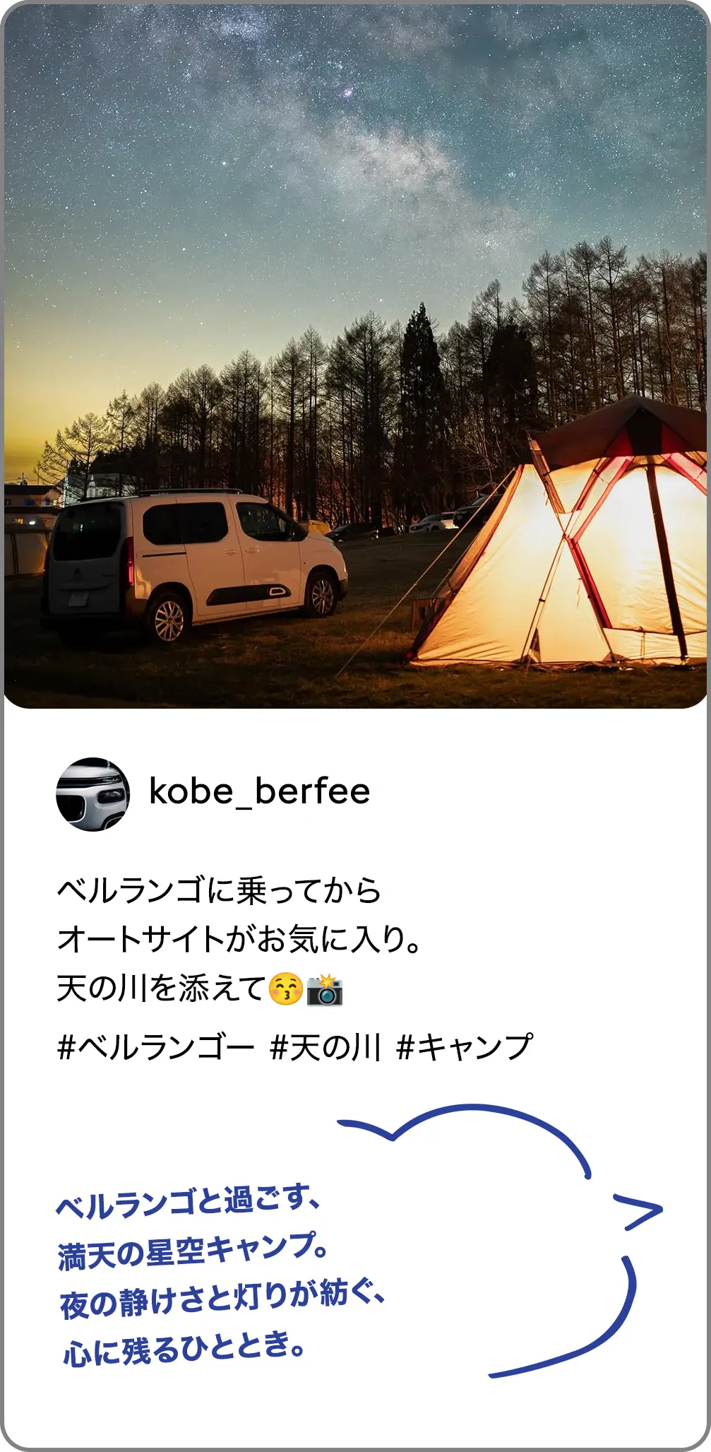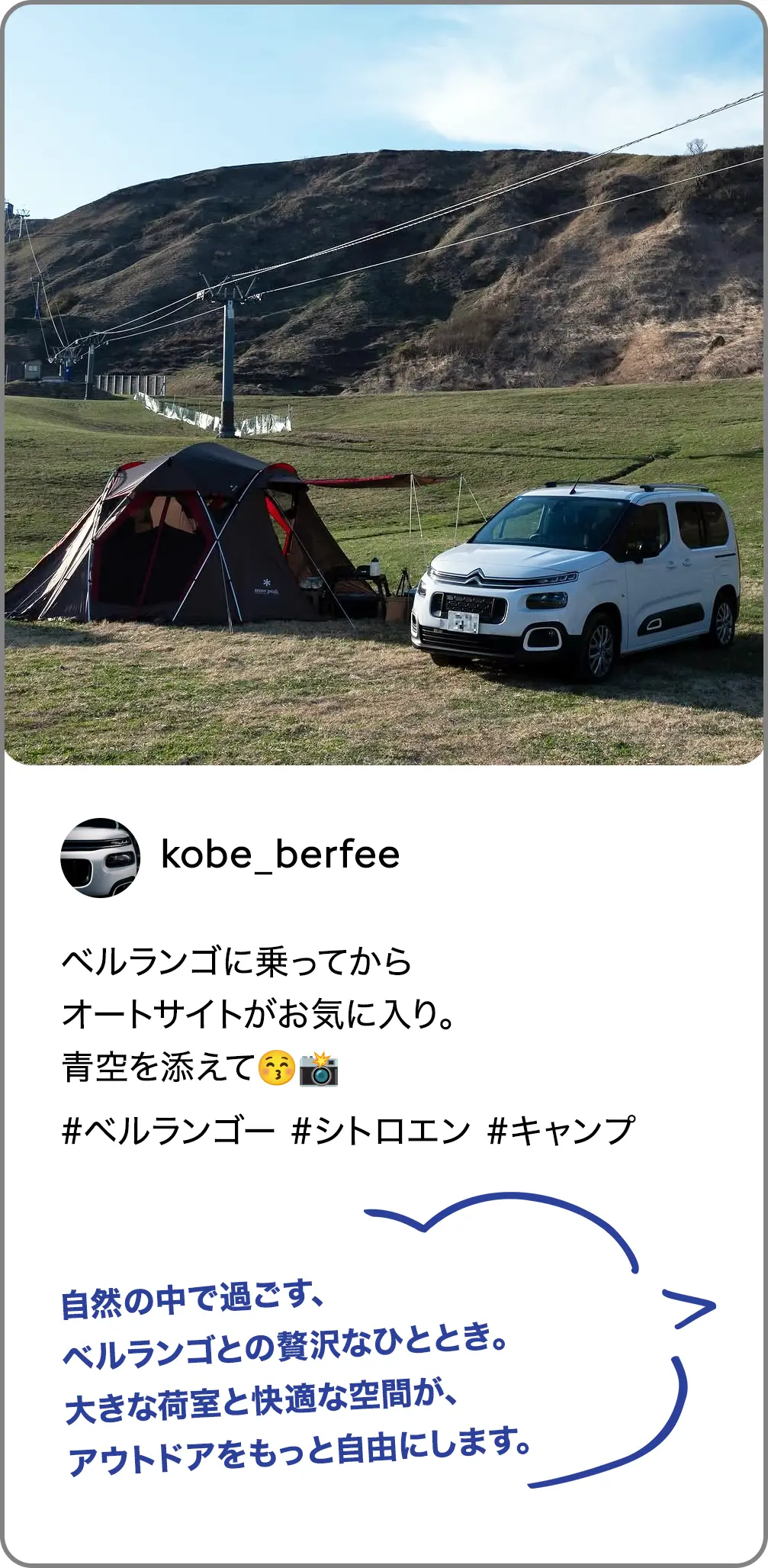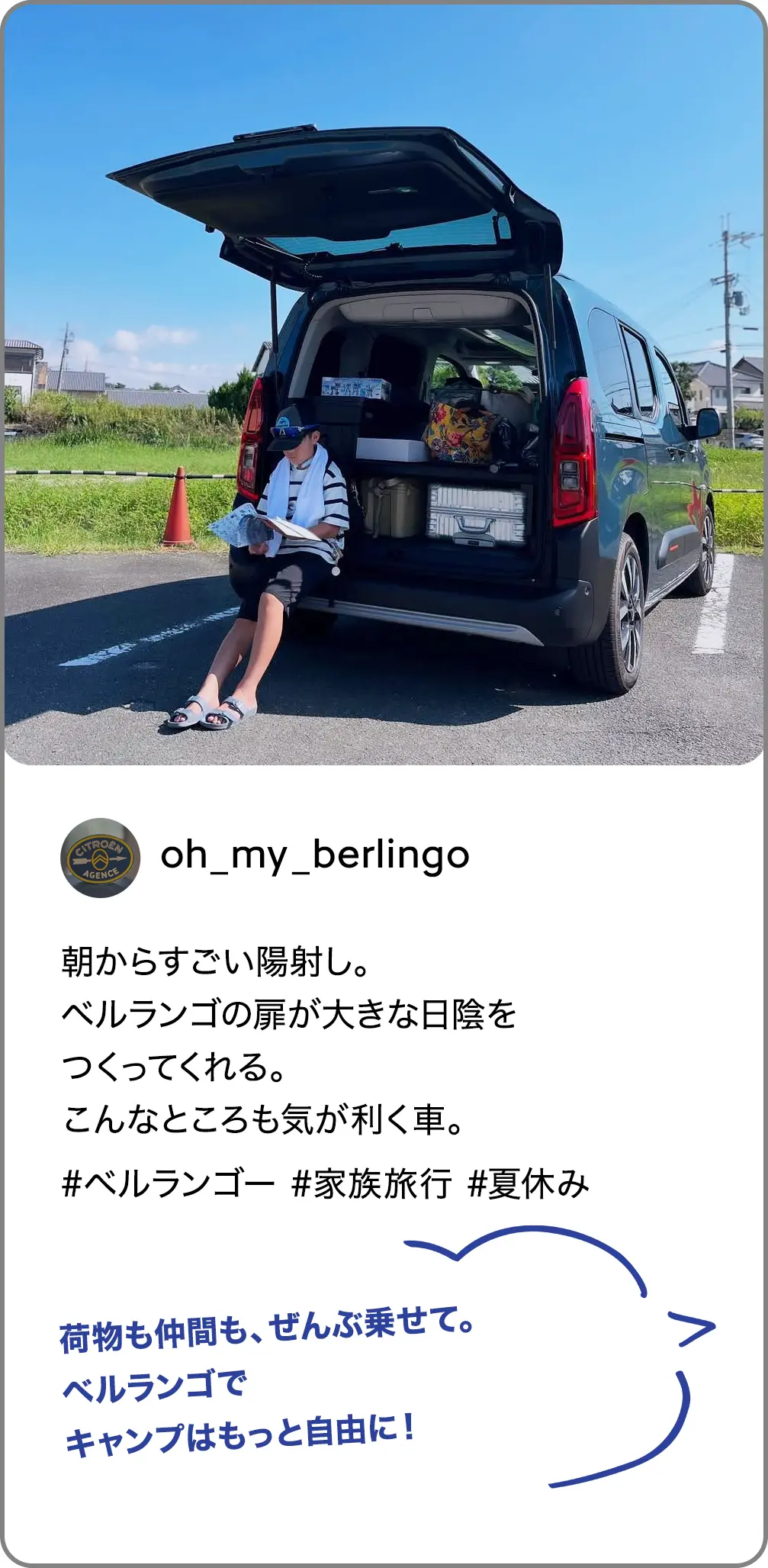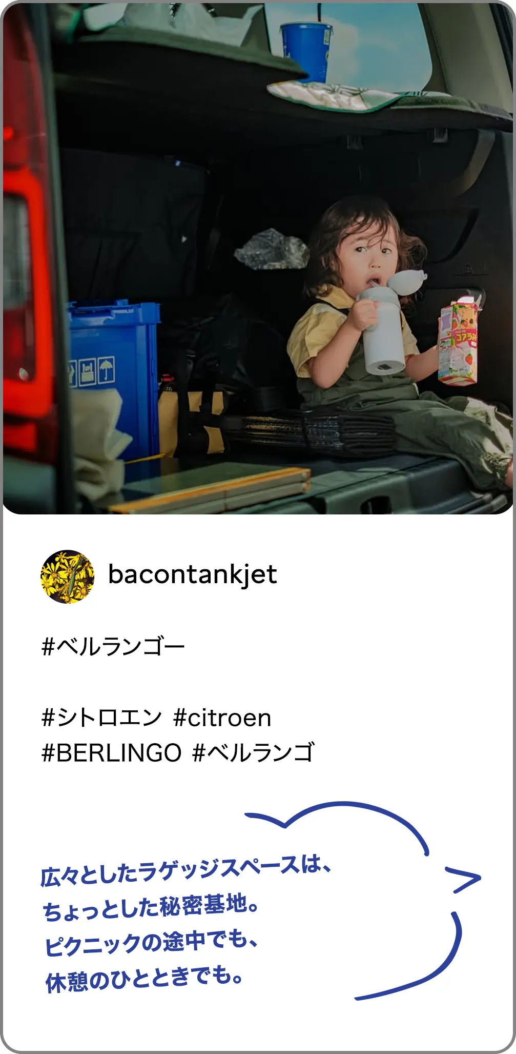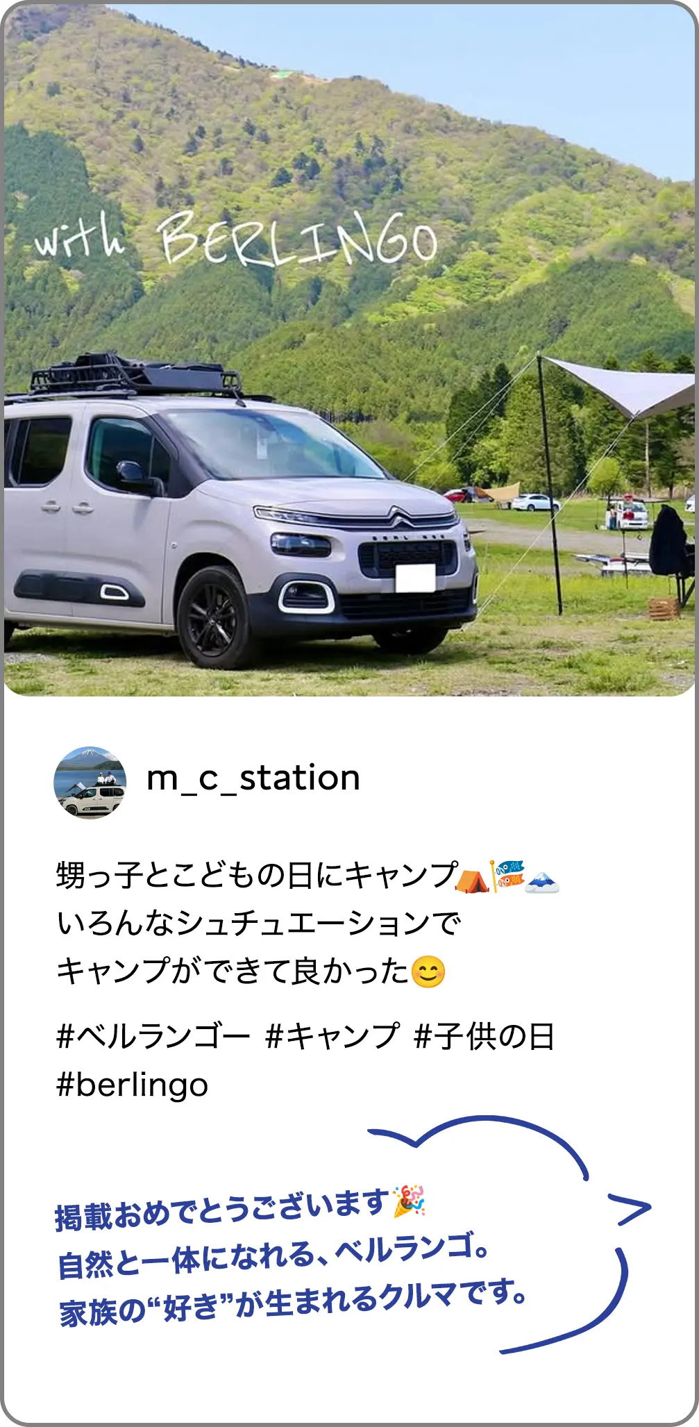 ハッシュタグ「#ベルランゴー」をつけて、わが家のベルランゴの使い方など、ベルランゴと過ごす暮らしのシーン写真または動画を、XまたはInstagramに投稿してください。後日シトロエン公式SNSやWEBサイトに、みなさまの投稿をいくつか紹介させていただきます。