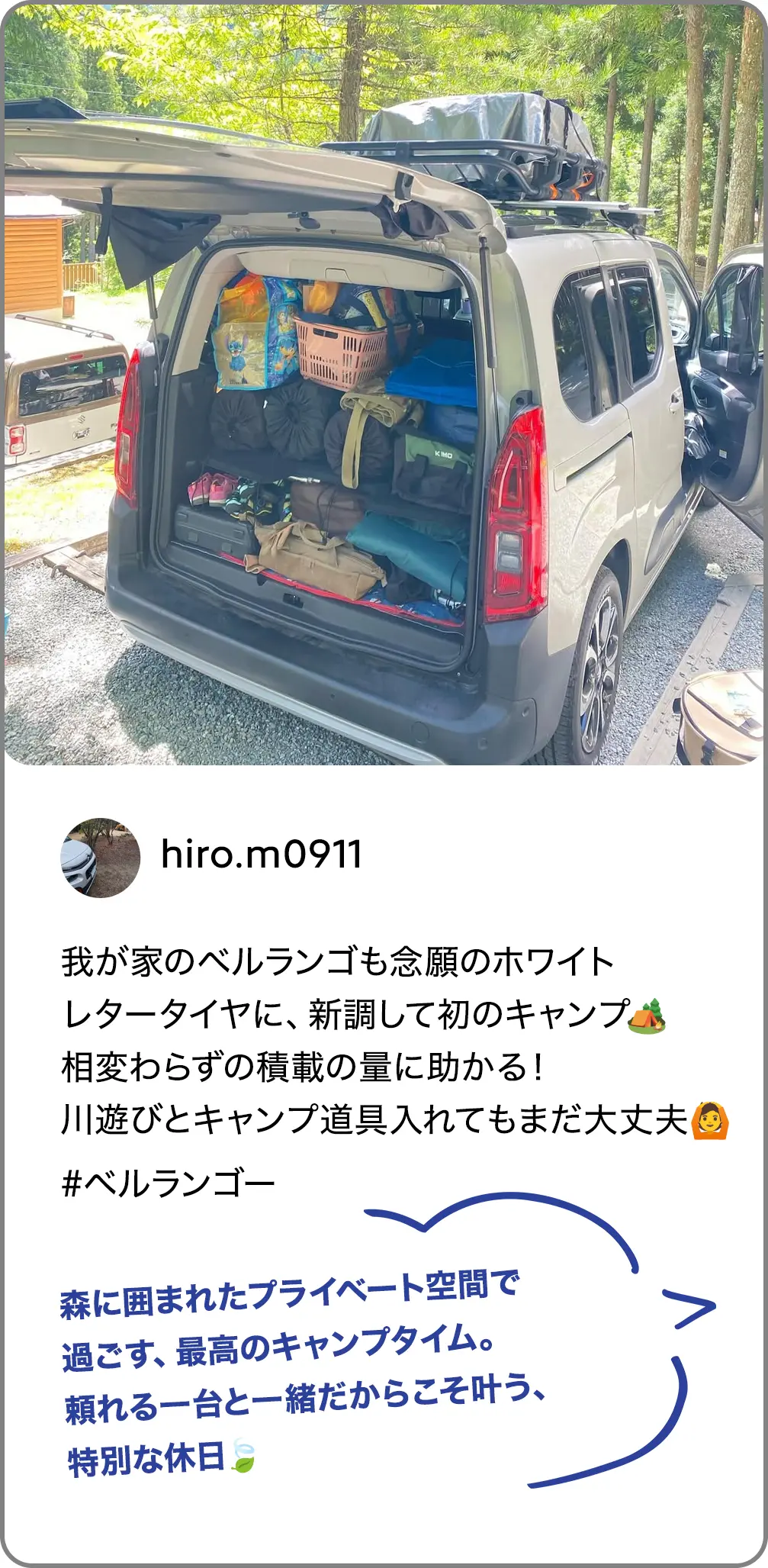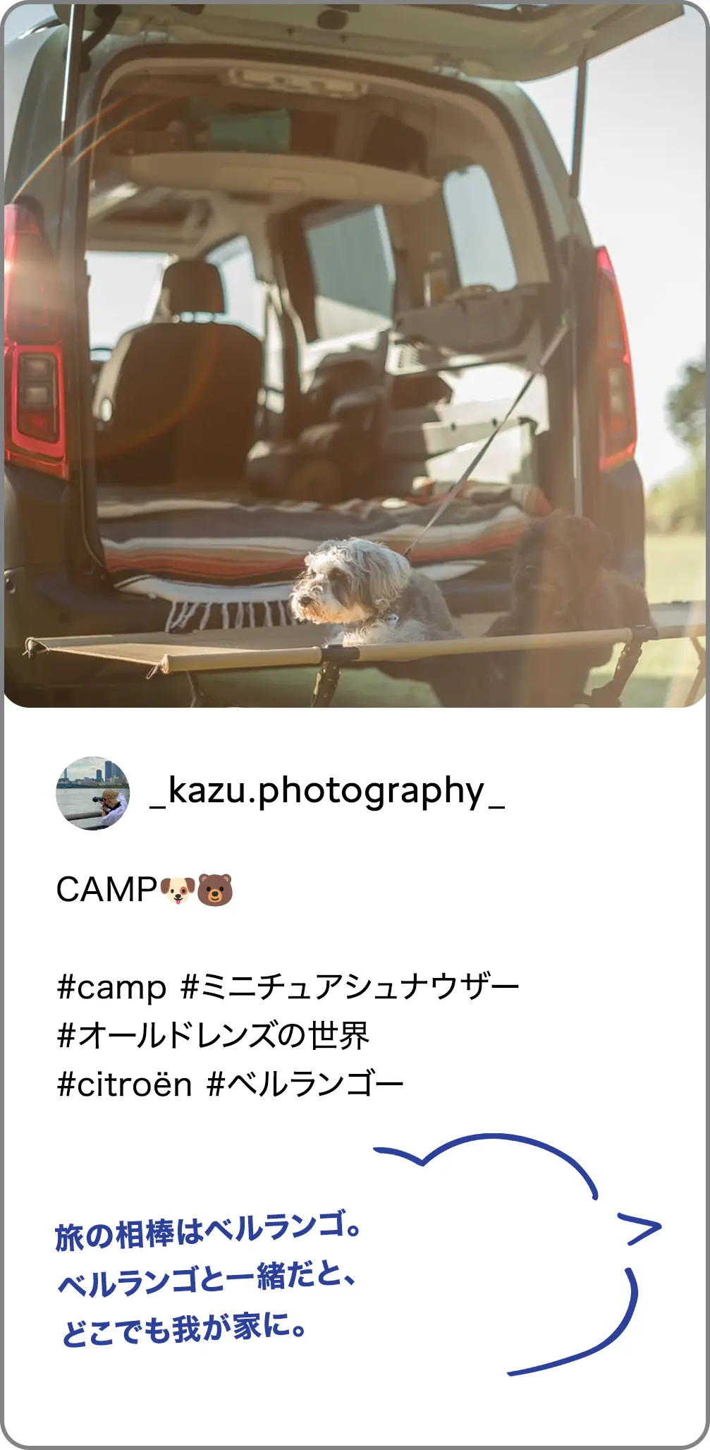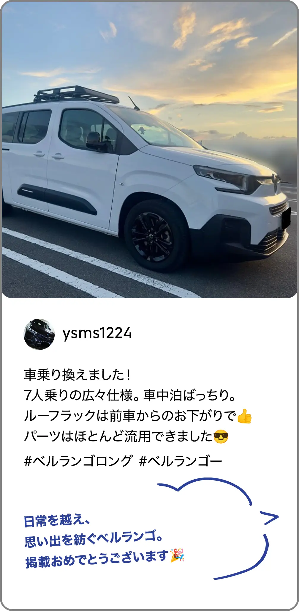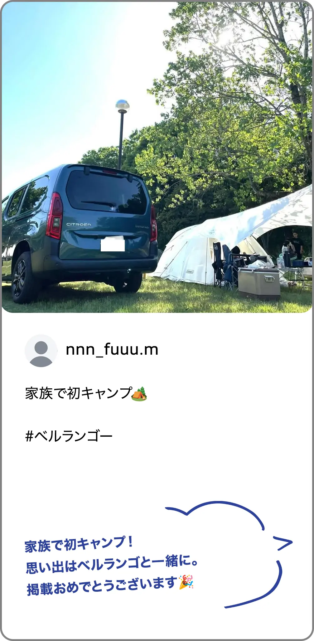 期間内に、XまたはInstagramの個人アカウントから、ハッシュタグ「#ベルランゴー」をつけて、わが家のベルランゴの使い方など、ベルランゴと過ごす暮らしのシーン写真または動画を投稿してください。